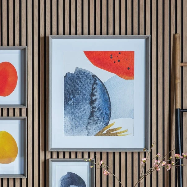 Add a touch of Japandi style to your space with this abstract wall art. Decorated with a bright primary colour palette and framed with a simple white mount, this piece is finished with a grey wood effect frame to complete the look.