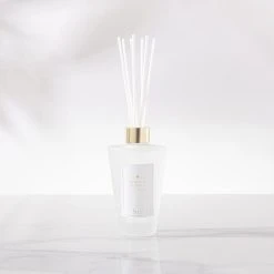 This modern linen fragrance opens with fresh citrus and leads to a white floral heart of lily and jasmine. Bamboo accords are complemented with white musk, vanilla & oak moss. The diffuser liquid comes within a frosted glass vessel with a gold trim, perfect for displaying with your home.