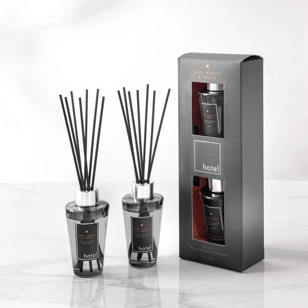 A woody combination of neroli and patchouli, leads into a sensuous blend of amber, sandalwood and sweet spices. Included in this set are two 80ml diffusers. Each vessel comes in a translucent black vessel with a matte silver effect trim and will last up to 7 weeks each.